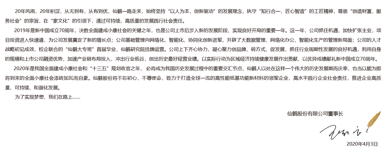仙鶴股份有限公司將一如既往奉行“創造財富,服務社會”的價值理念,發揚“誠信、高效、創新、圖強”的企業精神,爭做特種紙行業的領軍企業,為客戶創造價值,為員工創造福祉,為股東創造回報,為社會創造效益。